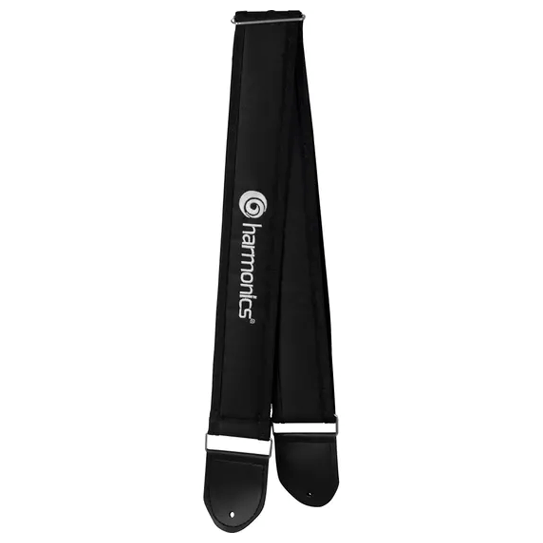 A correia acolchoada da Harmonics é feita de nylon, um material resistente para aguentar a rotina de um músico. Possui ponteiras de couro que além de fixar melhor na roldana, ainda dá a flexibilidade necessária para uma performance de palco incrível.